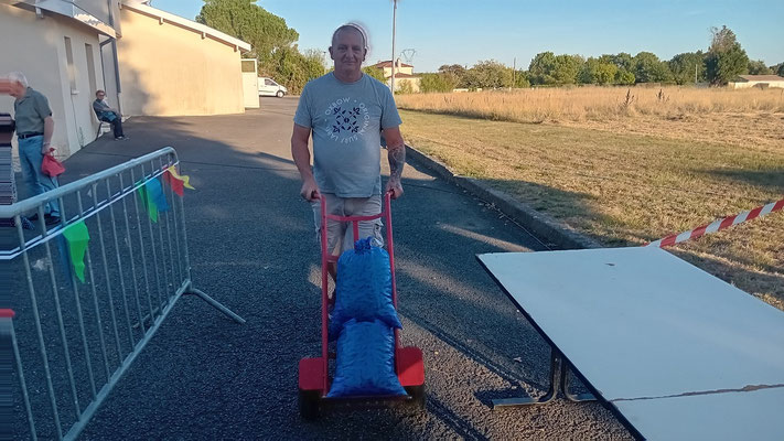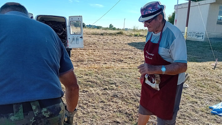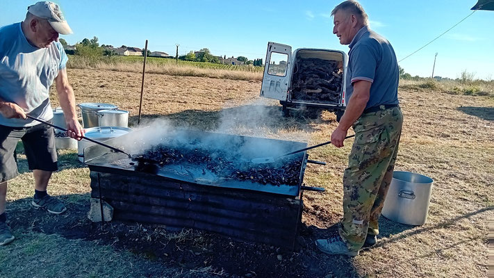 Le samedi se révèle être une journée longue dédiée aux préparatifs. Nous nous levons tôt, notre Président prenant la route dès 4 heures pour récupérer 170 kg de moules auprès d'un pêcheur breton, qui vient nous livrer à Bordeaux. Par la suite, il nous faut également récupérer des rôtis de bœuf dans la région blayaise. À 8 heures, avec l'aide de J. Noël et Philippe, tout est stocké dans la chambre froide. L'équipe de bénévoles s'active alors pour procéder à l'installation de la cuisson et des autres équipements nécessaires.