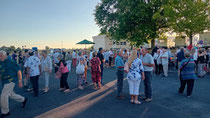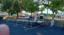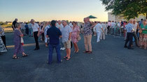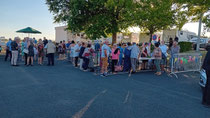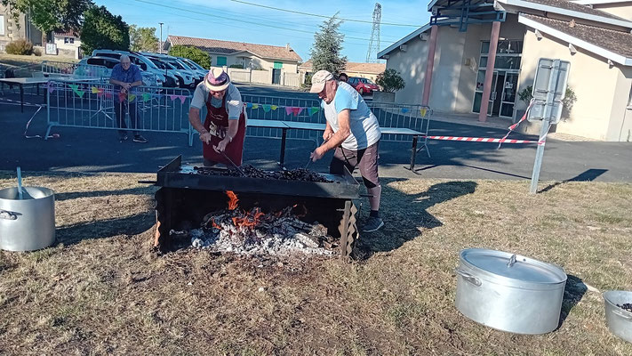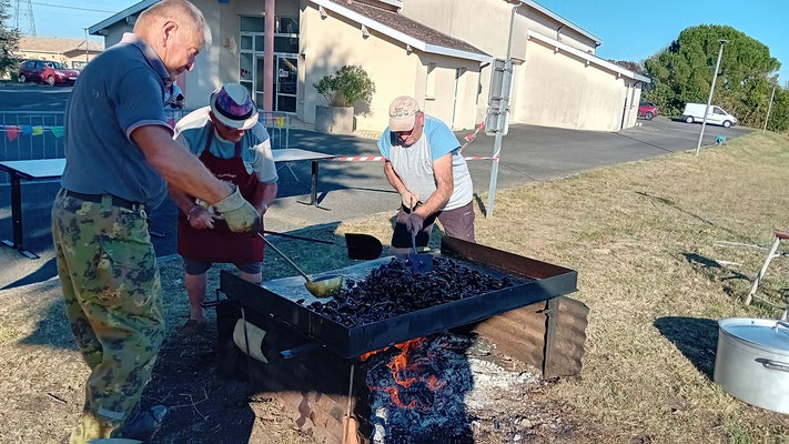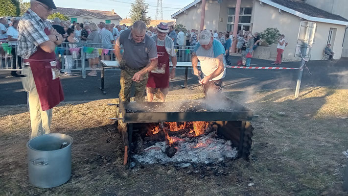 À 19 heures, les festivités ont débuté. Les convives arrivent, le bar proposant des boissons à 1 € est opérationnel, tandis que le feu sous la plancha est allumé par nos chefs cuisiniers dévoués, utilisant des pieds de vignes locaux. Les curieux observent cette cuisson tout en savourant l'apéritif.