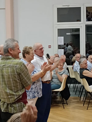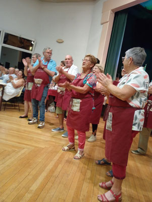 Le Président, en reconnaissance du travail de son équipe, invite chacun à se rassembler devant la scène pour recevoir les applaudissements du public, en témoignage de leur excellent travail. Les félicitations s'adressent à tous, des cuisiniers aux serveurs, avec une mention spéciale pour Louane, la petite fille de nos amis Gislaine et Christian, qui est venue renforcer l'équipe pour cette soirée. Bravo et merci, et nous serions ravis de la revoir parmi nous à l'avenir!