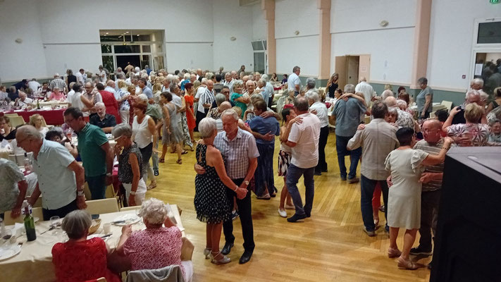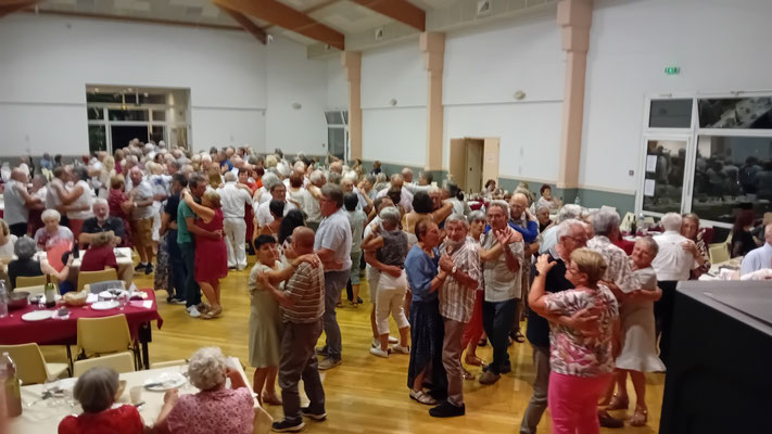 Ainsi, les premiers plats de moules ont été servis, et le Président a demandé des applaudissements de la part de l'assemblée. En qualité de Chef de salle, il a guidé le service de manière optimale, en veillant à ce que les musiciens soient servis en priorité pour pouvoir rapidement lancer le bal. Dès que les premières assiettes étaient vides, la fête s'est rapidement mise en marche, marquant ainsi une première pause digestive, avant le deuxième service de moules, cette délicatesse est si appréciée qu'elle frôle la gourmandise. Nos convives font preuve d'enthousiasme et contribuent à l'ambiance festive. La suite du repas ne se fait pas attendre. Les cinquante kilogrammes de rôtis de bœuf, cuits sur la braise des sarments de vignes, imprègnent déjà la salle d'une odeur délicieuse. Le service est en marche.